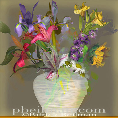 For a number of years I have been painting, exploring personal reflections on family. Then in 1986, I bought my first computer, and scanner and started scanning flowers. The odd depth of field and relative flatness of space revealed by the scanner captivated me. Something I had also been exploring in my paintings. I started arranging flowers in fields and also as bouquets, sometimes drawing the vases, and eventually scanning antique vases to use in the arrangements. Some of the files grew as large as 70 different layers. I have been working with Hunter Editions in Maine to print the work on archival paper since I started using computer scanners.