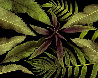 June Roadside Foliage - In this composition, I was inspired by the colors and textures of these Staghorn Sumac and Joe Pye Weed leaves. Both are common wild plants locally. The former is a small tree, a colonizer of disturbed places; the latter, a perennial growing to 12 feet tall, prefers wet areas and sports a large, deep pink flower head in August, attractive to butterflies and other insects.